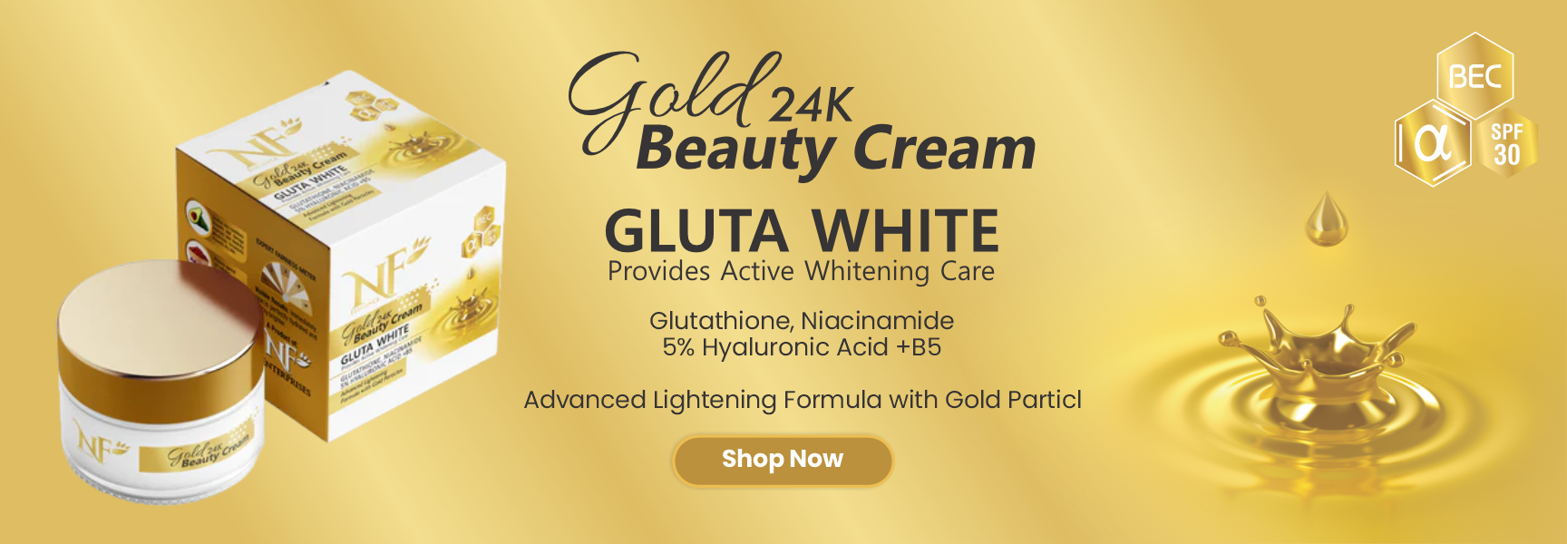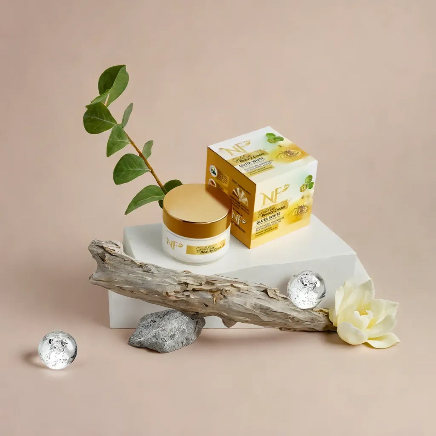 NF Elegance combines advanced formulations with the finest natural ingredients to create products that nourish, protect, and revitalize your skin. Our Gold 24K Beauty Cream is a testament to our commitment—crafted with glutathione, niacinamide, hyaluronic acid, and Pro-Vitamin B5, along with a touch of pure gold particles for an unmatched radiance.